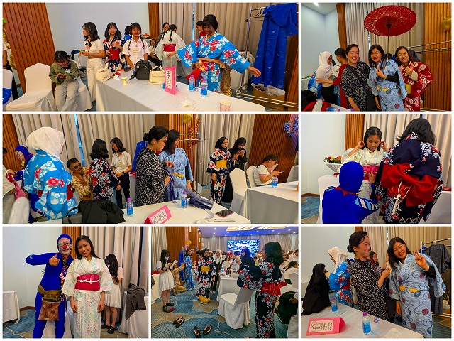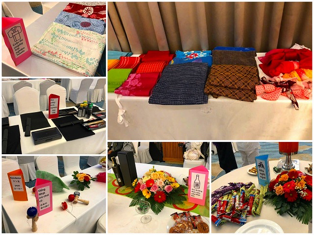 イベントは、美容体験・ヘアアレンジ体験・着付け体験・ボクシング体験があり、各テーブルでは日本酒利き酒コーナー・おにぎりから揚げ提供コーナー・書道・華道・茶道・折り紙など日本文化を体験してもらえるように準備をしました。