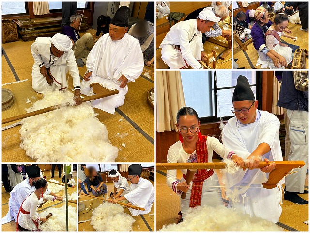 奉納演奏は叶いませんでしたが、民族衣装を着て参拝をさせていただき、綿打ち~糸を紡ぐ体験もさせていただけました。貴重な経験をさせていただきありがとうございました![]()